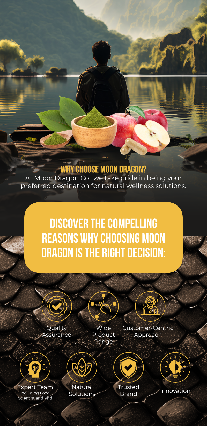 We're dedicated to creating innovative botanical solutions that empower you to live your best life. Experience vitality, focus, and balance with Moon Dragon.